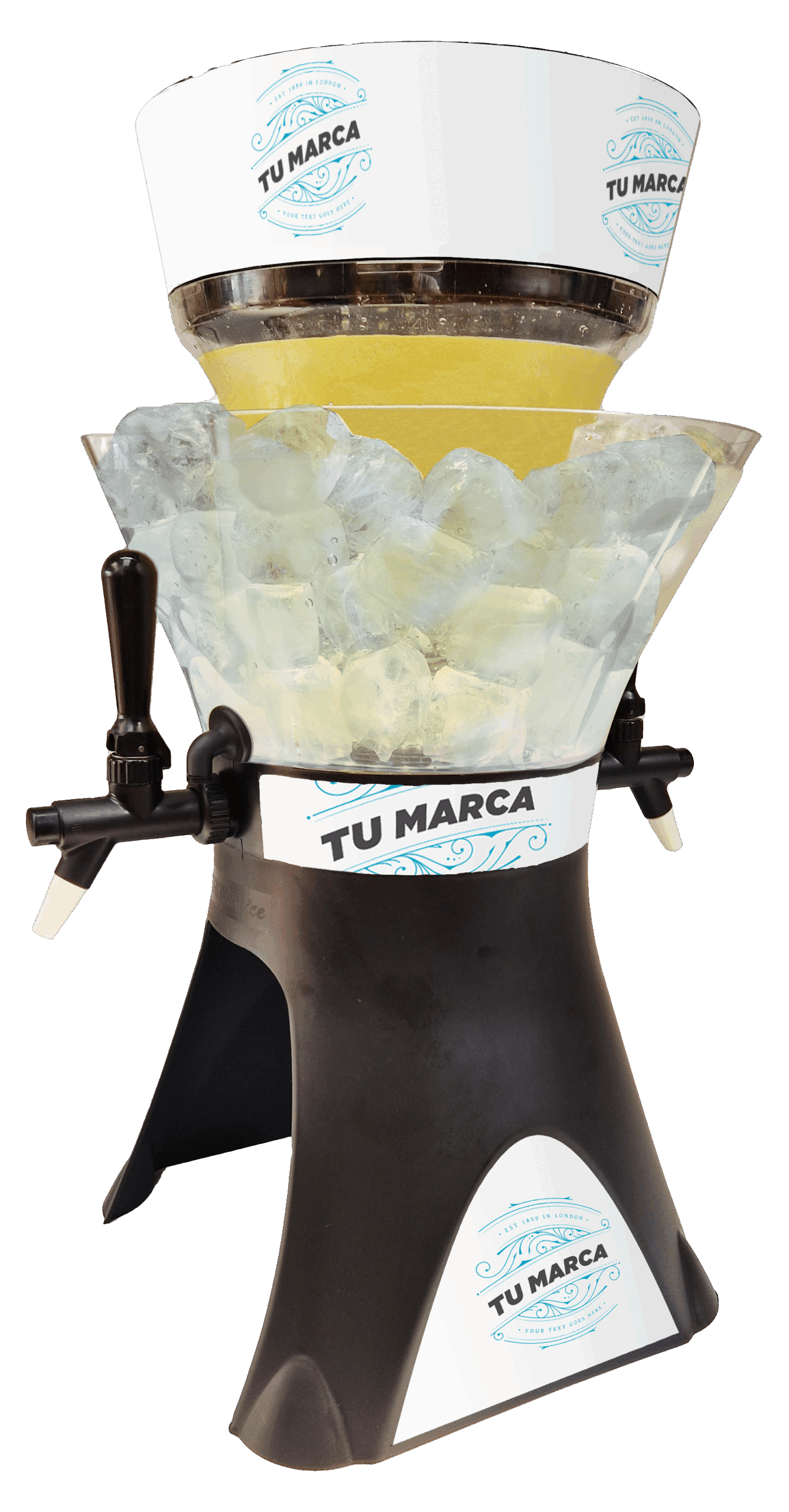 El profesional del establecimiento realizará la mezcla del Combinado seleccionado, añadiendo todos los ingredientes en el Vaso del dispensador, llenando la Hielera con cubitos de hielo hasta su máxima capacidad y colocando las pinzas en su borde. Nuestra recomendación: 1 L de destilado y 3L de refresco.